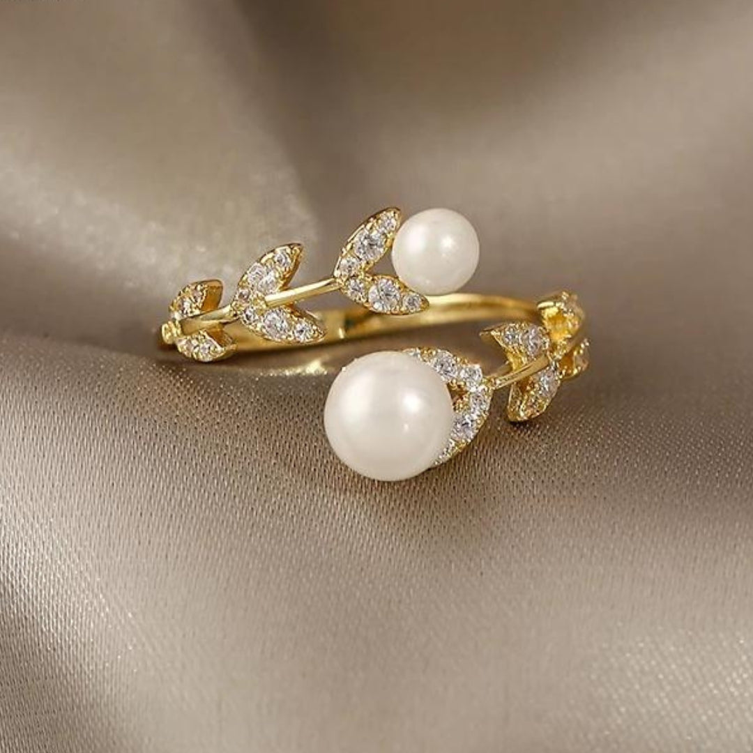 Justerbar ring med blade og perler i guld